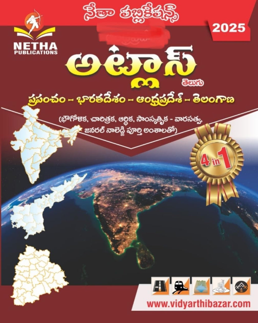 The NETHA 4 in 1 Atlas offers comprehensive geographic insights covering the World, India, Andhra Pradesh, and Telangana, tailored specifically for Telugu medium readers. It serves as an expert reference tool, combining detailed maps and informative content to support deeper understanding of diverse regions. Ideal for students and professionals alike, this atlas enables precise geographic navigation and contextual learning in one consolidated volume.